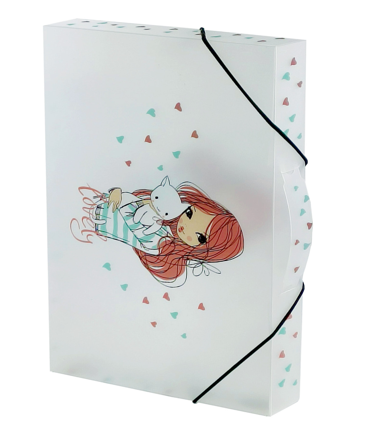 Case of A4 format with design imprint is secured by inner flap and elastic band against content falling out. It’s equipped with handle for comfortable manipulation. 0,8 mm polypropylene makes it durable against damaging. The case is necessary part of student’s equipment when bigger amount of books, notebooks or other school stationery is needed to be stored. Case is made in four different designs. Dimensions: 230 x320 mm, thickness 35 mm.